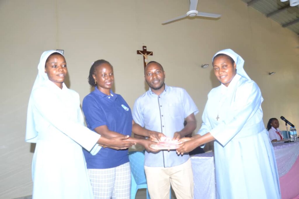Akikabidhi zawadi ya ushindi wa sh.300,000 kwa shule ya Anwarite inayomilikiwa na Jimbo Katoliki Moshi ambayo imeshinda kwa