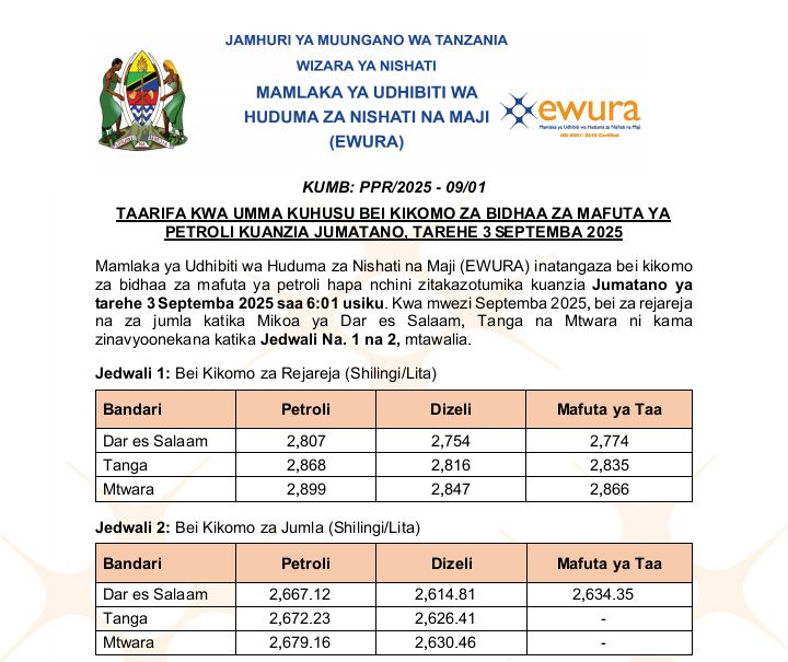 Mamlaka ya Udhibiti wa Huduma za Nishati na Maji (EWURA), imetangaza bei kikomo za mafuta zinazotumika kuanzia Septemba 3, 2025, zikionesha kupungua kwa shilingi 36 kwa bei ya petroli na shilingi 23 kwa bei ya dizeli.Kwa mafuta yaliyopokelewa bandari ya Dar-es-Salaam,Tanga na Mtwara mtawalia.