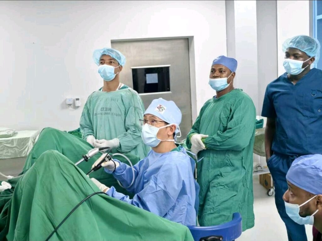 Wakati wa upasuaji wa kuondoa mawe ya figo, Dkt. Wang aliendelea kubadilishana uzoefu wa kitaalamu na Dkt. Hassan Mkoko na madaktari wengine wa ndani, akisisitiza uwezekano wa kutumia mbinu za kisasa kama laparoscopy badala ya upasuaji wa wazi.