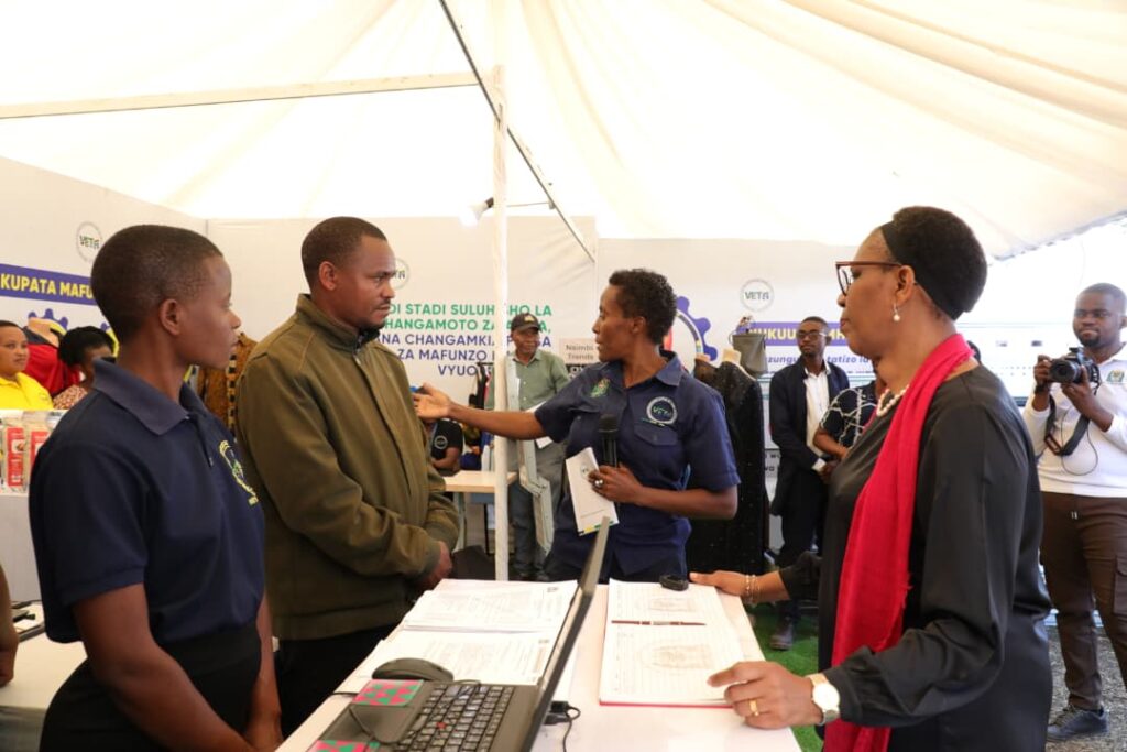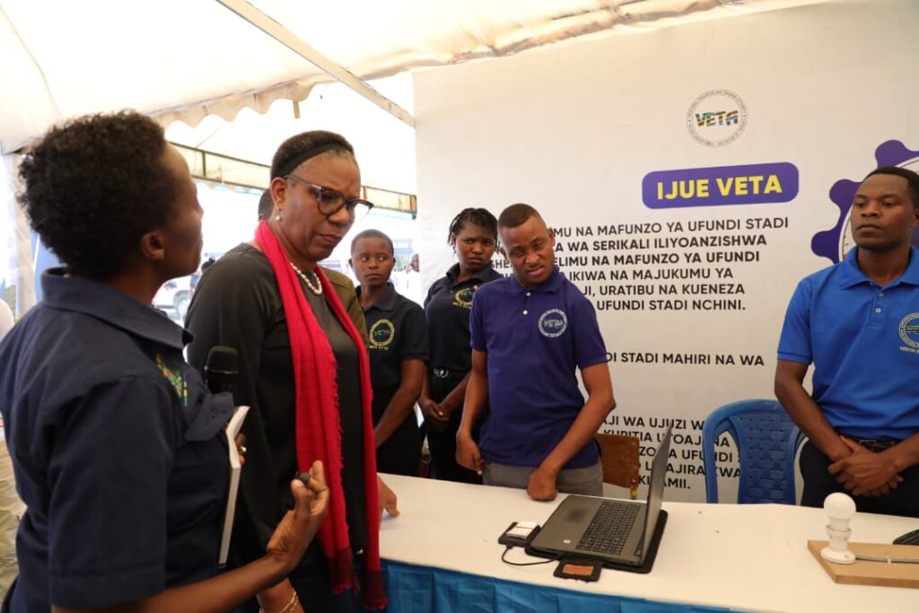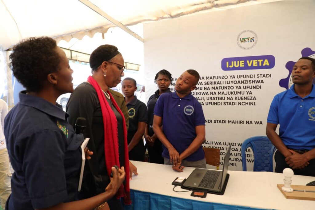 KATIBU Mkuu ,Ofisi ya Waziri Mkuu Mary Maganga ametembelea banda la Mamlaka ya Elimu na Mafunzo ya Ufundi Stadi (VETA) katika maonyesho ya wiki ya Vijana mkoani Mbeya ambapo amejionea kazi mbalimbali zinayofanywa na vijana wakiwemo wenye ulemavu.